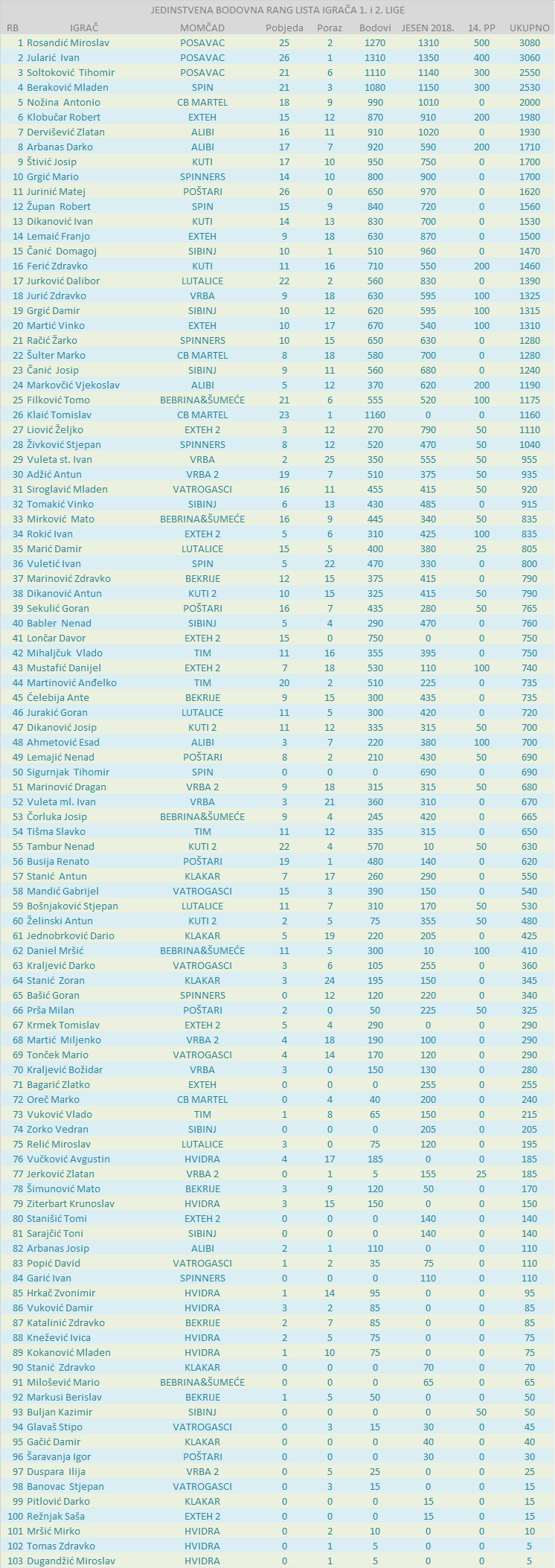 JEDINSTVENA BODOVNA RANG LISTA IGRAČA 1. i 2. LIGE: