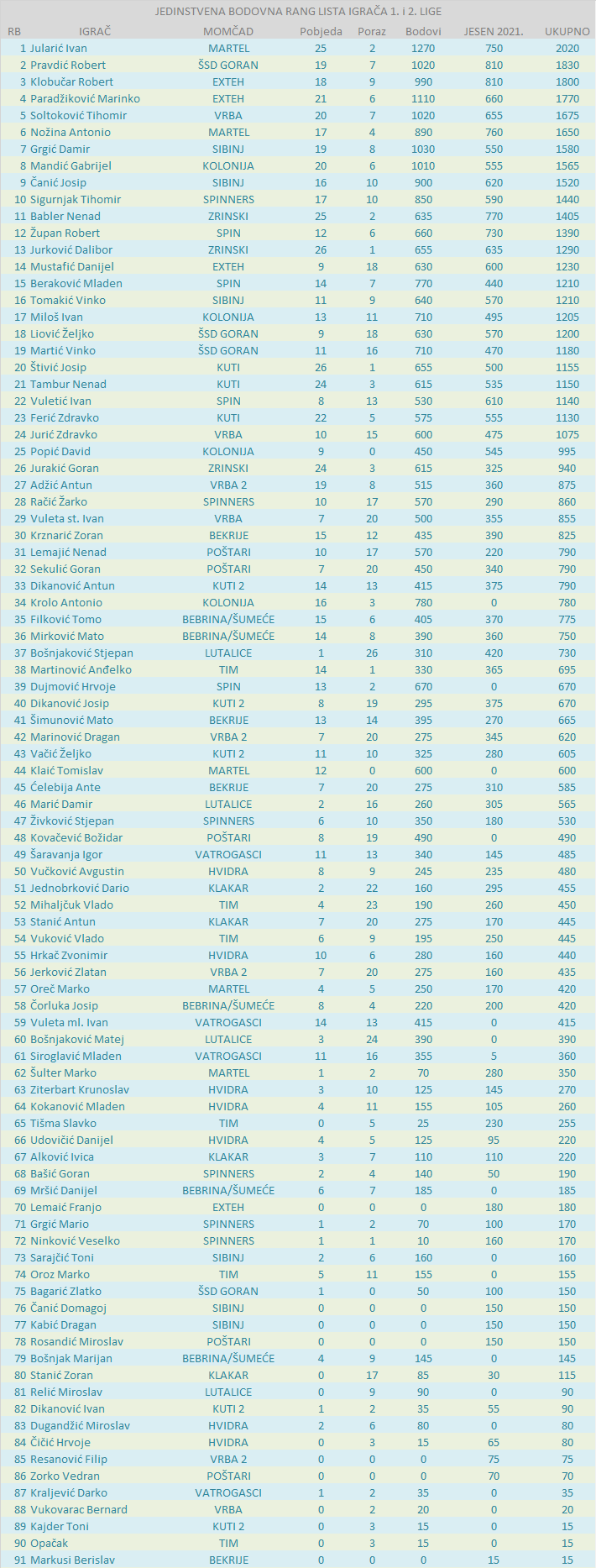 JEDINSTVENA BODOVNA RANG LISTA IGRAČA 1. i 2. LIGE:
