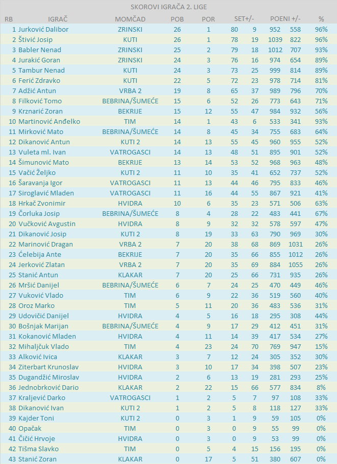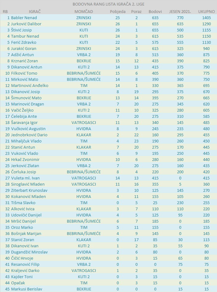 BODOVNA RANG LISTA IGRAČA 2. LIGE: