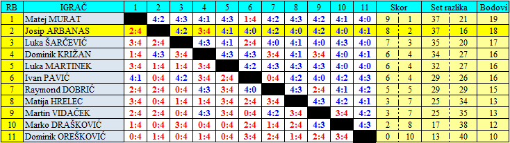 Kod juniora se igra na 4 dobivena meča, a trećina mečeva je upravo i igrana u 7. setova. Evo križne tablice, a zapisnici su dignuti na web stranicu OŠB.