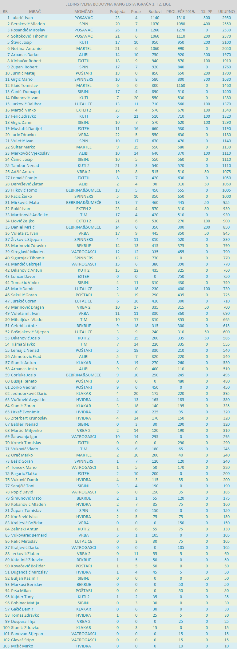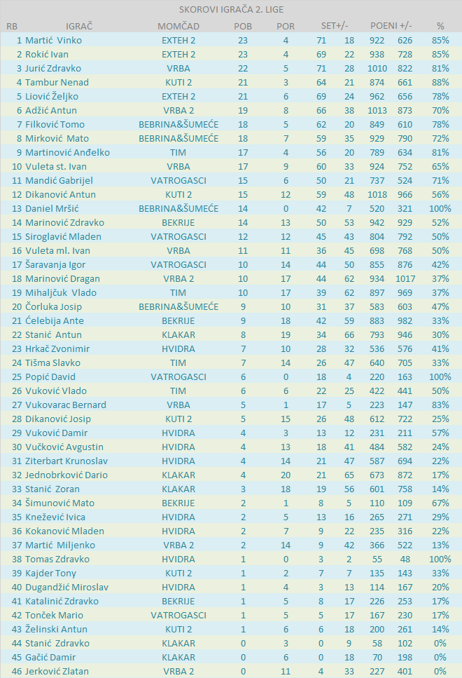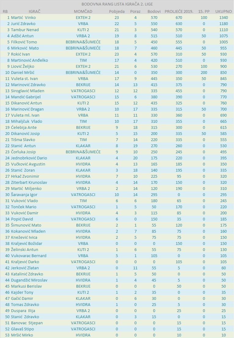 BODOVNA RANG LISTA IGRAČA 2. LIGE: