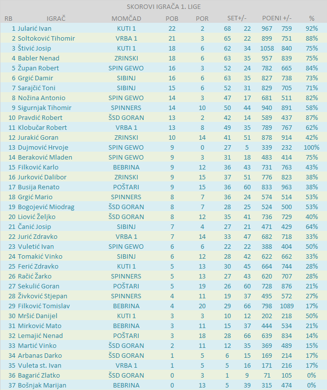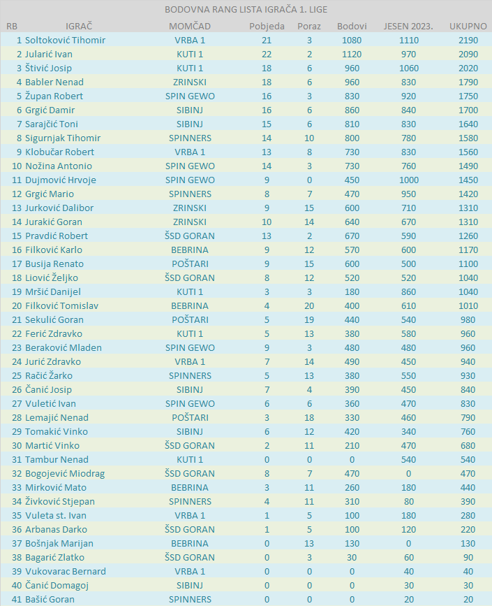 BODOVNA RANG LISTA IGRAČA 1. LIGE: