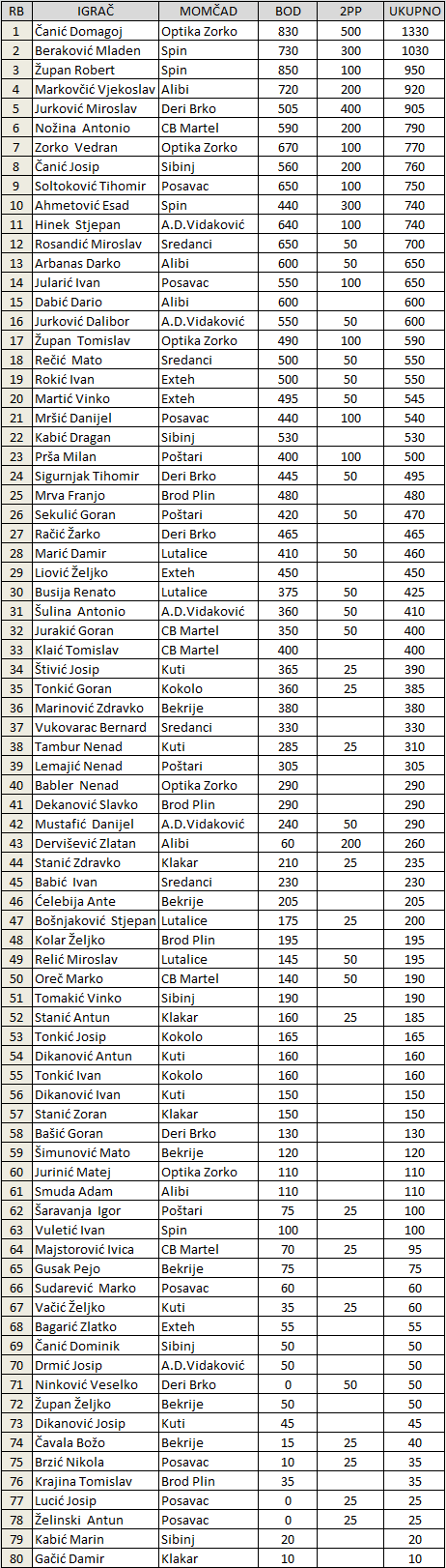 Ujedno prilažem trenutnu bodovnu jedinstvenu rang listu nakon upisanih bodova sa pojedinačnog prvenstva.