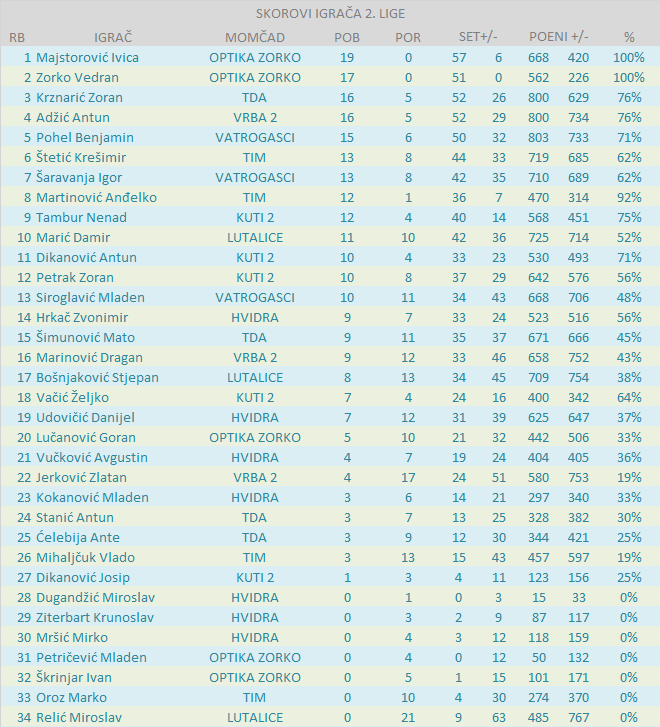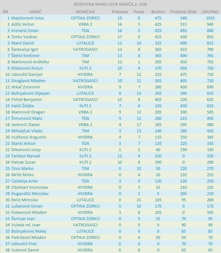 BODOVNA RANG LISTA IGRAČA 2. LIGE: